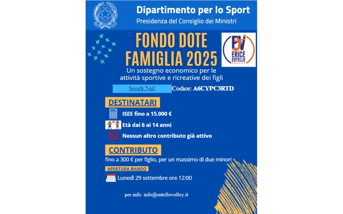 La domanda di assegnazione del contributo, da parte delle famiglie beneficiarie, deveessere compilata sulla piattaforma informatica raggiungibile all’indirizzo https://avvisibandi.sport.governo.it/, aperta dalle ore 12:00 del giorno 29.09.2025, inserendo regolarmente tutti i campi previsti.